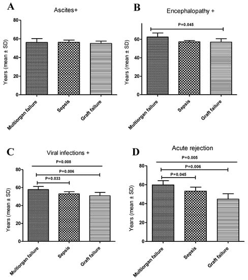 On the other hand, the mean ages among those who died due to multiorgan failure were also compared. We observed that the patients with ascites had a lower mean age of 56.1 ± 2.1 years compared to those with encephalopathy at 62.6 ± 4.3 years; these differences were statistically significant (p = 0.026: Table S1). Regarding the deaths from sepsis, statistically significant higher ages were observed among patients with ascites and encephalopathy compared to patients with viral infections (p = 0.034 and p = 0.016, respectively) or chronic rejection (p = 0.003 and p = 0.009). Similar results were found in deceased patients who died of GF.