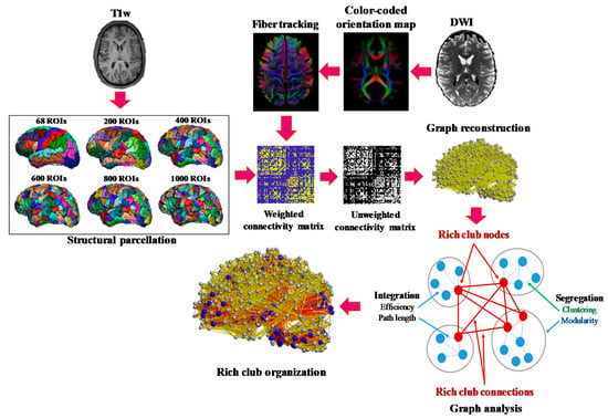 The human brain connectome has greatly expanded our understanding of how cognitive processes emanate from a fundamental structural substrate [1]. In the past decade, structural connectivity analysis using graph metrics has been widely used to investigate the topological properties of brain structural networks derived from diffusion-weighted imaging (DWI) by modeling white-matter pathways connecting brain regions [2,3]. Many studies have focused on graph measures of network segregation (e.g., clustering coefficient and modularity) and measures of network integration (e.g., degree, characteristic path length and global efficiency) to investigate the small-worldness property of the human brain, exhibiting an optimal balance between the segregation and integration of information [2,4]. In recent years, there has been growing interest in the more complex topological properties of human brain networks. More specifically, the existence of a densely connected cortical “rich club” of hubs, playing a crucial role in global brain communication through short communication pathways, has been considered as the key characteristic of brain networks exhibiting a hierarchical structure [5]. It is suggested that any damage to cortical rich-club regions can cause large widespread disruption across large-scale brain networks with a significant impact on cognition [6,7,8,9].