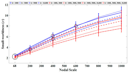 Our results showed an increasing trend for the small-worldness curves (σ) with an increasing number of nodes for each DWI scheme (Figure 3). The networks constructed using the single-shell scheme with b = 1000 or 10,000 s/mm2 exhibited higher small-worldness in comparison with other b-values regardless of the nodal scale. In this category, the lowest small-worldness was obtained with b = 5000 s/mm2. Among the multishell imaging schemes, the networks constructed using the three-shell (b = 3000, 5000, 10,000 s/mm2) and two-shell (b = 1000, 3000 s/mm2) sampling schemes exhibited the highest and lowest small-worldness, respectively. Overall, the imaging schemes that included shells with b-values higher than 5000 s/mm2 exhibited significantly lower small-worldness. Moreover, the networks constructed at finer nodal scales displayed significantly (p < 0.05) higher small-worldness with larger confidence intervals across subjects in comparison with lower nodal scales.