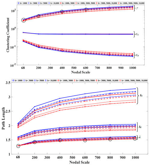 where CG and IG denote the average clustering coefficient and the average path length of the graph, respectively, and R represents a “random” graph, which was constructed for the graph using the Erdős–Rényi (ER) model, in which both the graph and the random graph had the same average nodal degree [2]. For R, the values of CR (average clustering coefficient) and IR (average path length) were estimated as follows: