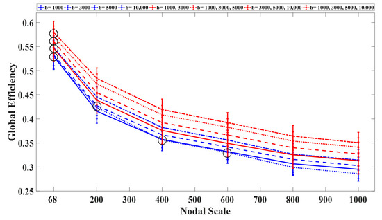 The global efficiency declined exponentially with the nodal scale (Figure 6). Among the single-shell schemes, the networks constructed using b-values of 3000 s/mm2 and 10,000 s/mm2 exhibited the highest and lowest global efficiency regardless of the nodal scale, respectively. Among the multishell sampling schemes, the networks constructed using two shells (with b = 1000, 3000 s/mm2) and three shells (with b = 3000, 5000, 10,000 s/mm2) exhibited the lowest and highest efficiency, respectively. Significant differences (p < 0.05) in global efficiency were observed between the single- and multishell schemes at different nodal scales. Overall, the inclusion of b-values higher than 5000 s/mm2 increased the global efficiency of the structural networks.