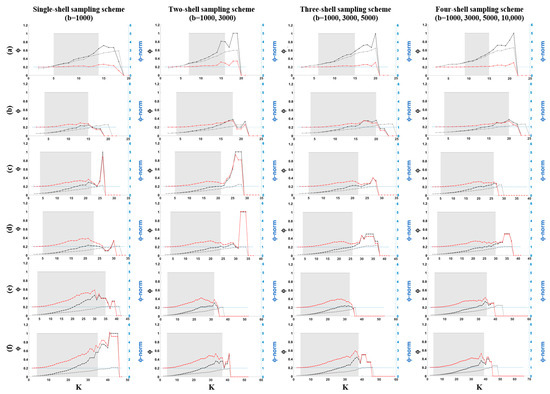 Rich-club curves (ϕ and ϕrandom) as a function of degree (K) for each backbone structural network and its corresponding random networks for the single-shell (b = 1000 s/mm2), two-shell (b = 1000, 3000 s/mm2), three-shell (b = 1000, 3000, 5000 s/mm2) and four-shell (b = 1000, 3000, 5000, 10,000 s/mm2) sampling schemes at the nodal scales comprising (a) 68, (b) 200, (c) 400, (d) 600, (e) 800 and (f) 1000 nodes. The figures show the rich-club coefficient values for ϕnorm (red), ϕ (black) and ϕrandom (light gray).