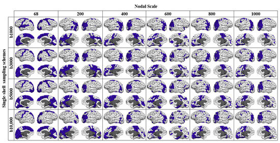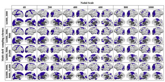 Modularity also showed an increasing trend with the nodal scale, demonstrating the tendency of the structural networks to form more communities at finer nodal scales, especially for the networks constructed using the single-shell schemes (Figure 5). Regardless of the nodal scale, the multishell sampling schemes that included shells with b-values higher than 5000 s/mm2 exhibited lower values of modularity in comparison with the single-shell or other multishell sampling schemes. Regardless of the sampling scheme, the statistical comparison showed significant differences (p < 0.05) between the modularity values computed for the networks at different nodal scales.