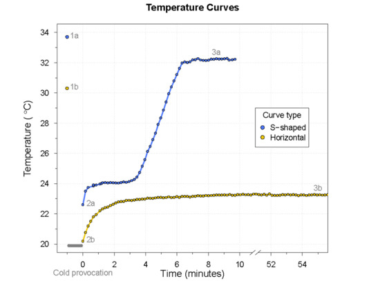 The thermographic procedure, preparations, and subsequent analysis were conducted as previously described [8]. In short, the participants’ hands were immersed in water of 10 °C for 60 s, and the rewarming period of the fingers was recorded using an infrared thermographic camera (FLIR SC600, FLIR® Systems, Wilsonville, OR, USA). The thermographic recordings resulted in rewarming curves, which were analyzed to obtain the seven temperature variables previously described [8]: baseline finger temperature (tbase), finger temperature immediately after cooling (t0), curve type, finger temperature halfway through rewarming (t50), end temperature (tend), time to tend, and the percentage of temperature recovery at tend (R%) (R% = temperature increase/initial temperature decrease) × 100% [12]. The categorical variable curve type described the course of the temperature curve as either S-shaped or horizontal. See Figure 1 for an example of each curve type with the associated thermographic images at the essential time points.