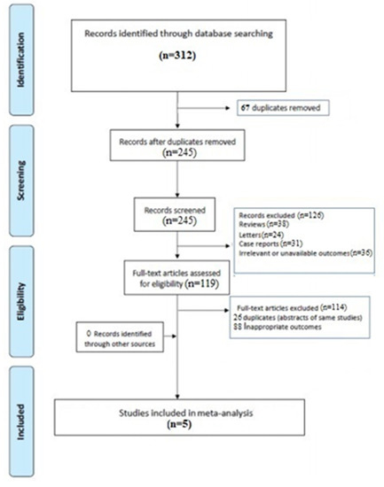 A total of 245 articles were retrieved after excluding duplicates. Subsequently, 126 were excluded for not meeting the inclusion criteria, leaving 119 full-text articles to assess for eligibility. Finally, five articles met the inclusion criteria and were considered for the analysis [23,24,25,26,27]. (Figure 1).