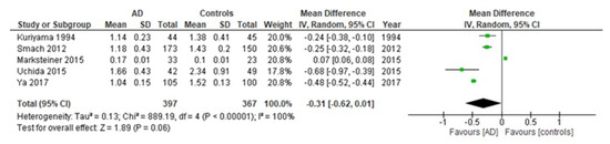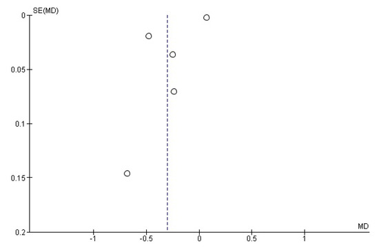 Compared to healthy controls, AD subjects had a significantly lower ApoA1 serum level. The pooled WMD from a random-effects model was −0.31 g/L (p < 0.0001) (95% CI: [−0.62–0.01]; I2 = 100%; test for overall effect: Z = 1.89; p =0.06 (Figure 2). The Egger’s test confirmed the absence of publication bias (t = 0.62, p = 0.576). The relative funnel plot is shown in Figure 3.