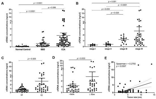 Plasma cell-free DNA (cfDNA) concentration. (A) Concentration of plasma cfDNA in CCA was significantly higher than normal control and patients with benign biliary disease (BBD) (p < 0.0001, Kruskal−Wallis test). (B) Concentration of cfDNA in CCA stage IV was significantly higher than stage I, II and III (p < 0.0001, Kruskal−Wallis test). (C) CCA patients with lymph node metastasis exhibited a significantly higher cfDNA concentration than CCA patients without lymph node metastasis (p = 0.005, Mann−Whitney U Test). (D) Concentration of cfDNA in CCA patients with tumor size greater than 5 cm was higher than those with tumor size lower than 5 cm (p = 0.033, Mann−Whitney U Test). (E) Concentration of cfDNA was positively correlated with tumor size of CCA patients (Spearman r = 0.28; p = 0.031). A p-value < 0.05 was considered statistically significant.