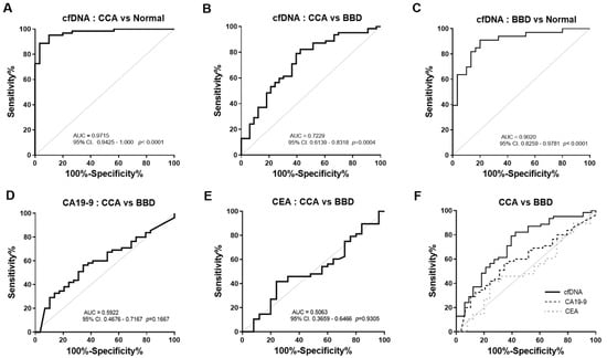 Receiver operating characteristics (ROC) curve analysis for discriminating CCA using plasma cfDNA levels. (A) Plasma cfDNA level yielded an AUC of 0.9715 (95% CI: 0.9425–1.000) in discriminating CCA from normal control and (B) an AUC of 0.7229 (95%CI: 0.6139–0.8318) in discriminating CCA from BBD. (C) cfDNA also showed discriminating ability with an AUC of 0.9020 (95% CI: 0.8259–0.9781) between BBD and normal control. The AUC of CA19-9 (D) and CEA (E) in discriminating CCA from BBD were 0.5922 (95% CI: 0.4676–0.7167) and 0.5063 (95% CI: 0.3659–0.6466), respectively. (F) cfDNA level offered a higher AUC in discriminating CCA from BBD than CA19-9 and CEA. Gray solid line: theoretically perfect performance of a potential biomarker as the reference line. Abbreviations; CCA: cholangiocarcinoma, BBD: benign biliary disease. Area under ROC curve (AUC) are indicated. A p-value < 0.05 was considered statistically significant.