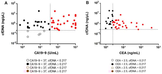 Diagnostic accuracy of cfDNA in comparison with CA19-9 and CEA. The scatter plots show (A) the distribution of CA19-9 level vs. cfDNA level and (B) the distribution of CEA levels vs. cfDNA level in CCA patients. The optimal cut-off levels of cfDNA level, CA19-9 and CEA are 0.217 ng/µL, 37 U/mL and 2.5 ng/mL, respectively.