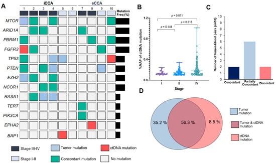 Mutational concordance across 10 CCA patients. (A) Onco-print chart showing the characteristic (staging and subtype) and mutation occurrence in ctDNA compared to matched tumor. Only mutated genes (n = 13) detected in ctDNA are shown. Bar graph shows the proportions of patients with mutated genes (Right). (B) Comparison of variant allele frequency (VAF) percentage in ctDNA stratified according to staging (stage I (n = 1), II (n = 3) and IV (n = 6)). (C) Numbers of matched tumor DNA and ctDNA samples in each patient-level concordance category. (D) The overlapping of mutations between cfDNA and tissue sequencing tests. iCCA; intrahepatic CCA, eCCA; extrahepatic CCA, Freq%: mutation frequency in patient, ctDNA: circulating tumor DNA.