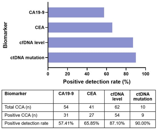 Patients with CCA are usually met with poor prognoses and significantly high morbidity rates, due to the limited options for early detection and treatment. Around 90% of patients would die within the first year of being diagnosed []. Surgical resection of CCA tumors is the treatment of choice, but most cases are inoperable. Despite the availability of many diagnostic tools, CCA diagnosis remains difficult []. In clinical practice, CA19-9 and CEA are the most frequently used blood-based tumor markers []. However, the lack of sensitivity and specificity has been a major problem in the use of most serum tumor markers for the diagnosis of cancers. In recent years, cfDNA analysis has received growing attention because of its applications as a surrogate marker for multiple indications in cancer, including diagnosis, prognosis, and monitoring []. Additionally, the combination of cfDNA markers with other blood-based tumor markers has recently shown improvement in diagnostic accuracy [,]. Moreover, sequencing of ctDNA has the potential to assess the genetic profile with a minimally invasive procedure []. Thus, the potential for use of ctDNA in the diagnosis and management of CCA is of interest. However, investigations into the use of ctDNA in CCA have previously been hampered by the rarity of the disease.