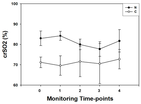 Higher perioperative crSO2 values (p < 0.01, for all) were observed at all monitoring time-points in N children (Figure 2).