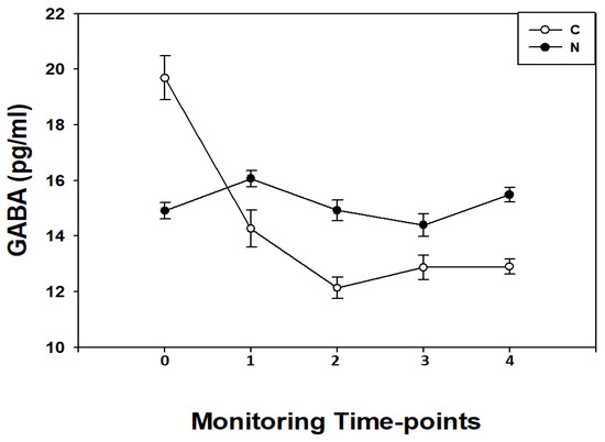In the C children, GABA blood concentrations showed a pattern characterized by a significant (p < 0.05, for all) progressive decrease in biomarker levels from T0 to T4 reaching the lowest point at T2.
