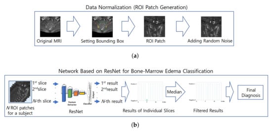 Overall process of the proposed method for diagnosing sacroiliac arthritis. (a) Process of ROI generation; (b) ResNet based network for Bone marrow edema classification.