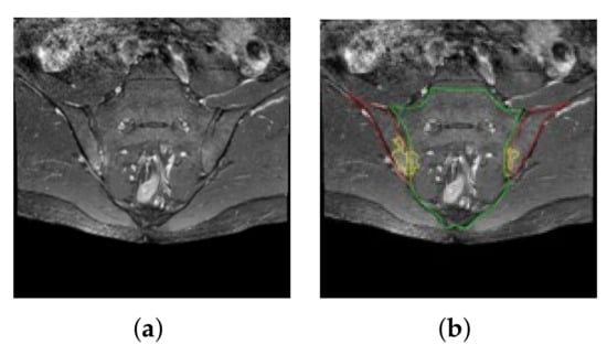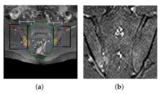 Example MR images of the SIJ region. (a) MR images including all areas surrounding the sacral and iliac bones; (b) annotated MR images of the sacral (green) and iliac (red) bones as well as bone marrow edema (yellow).