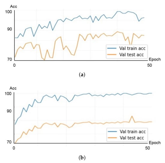 The ResNet architecture used in the proposed method has five types of models depending on the depth of the network. Experiments were performed on an 18-layer ResNet18 model and a 50-layer ResNet50 model to select a network with a more appropriate size for the data. Initially, about 30% of the training data of fold set 1 shown in Table 1 were separated and used as a validation set. Figure 5 shows the results of the validation experiment to check for overfitting of each model. In Figure 5, the horizontal axis represents the number of epochs of training, and the vertical axis represents the classification rate. The blue line corresponds to the results of the training data, and the red line corresponds to the results of the validation data. As shown in Figure 5, when the same dataset is used for both the ResNet18 and ResNet50 models, the ResNet18 model converges more stably for both the training and validation datasets for training up to 50 epochs. From these results, a classification network using the ResNet18 model was applied to the subsequent experiments.