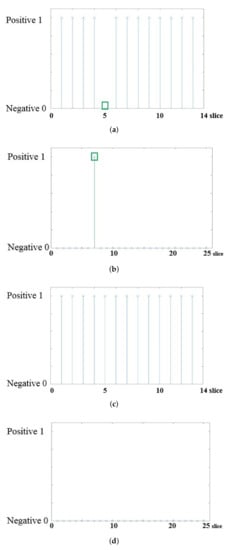 Figure 6 shows the results of automatically determining the presence of bone-marrow edema using ResNet from MR slices of axSpA and normal subjects in this study (Figure 6a: results for axSpA subjects, Figure 6b: results for normal subjects). In Figure 6, the horizontal axis represents the index when the MR slices are sequentially arranged from the lower to upper pelvis, and the vertical axis represents the classification result of ResNet for each slice. When a slice is classified as positive, a value of 1 is indicated, and when classified as negative, a value of 0 is indicated. First, the results of all MR slices for a single subject were stored in the form of a vector, and the final diagnosis of active sacroiliitis was determined for the subject through one-dimensional spatial filtering [46]. Since the slices corresponding to the adjacent indexes are the results of scanning adjacent parts, as shown in Figure 6, it is relatively likely that bone marrow edema is simultaneously found in adjacent slices containing the corresponding areas if bone marrow edema occurs in one area of the SIJ. Thus, if bone marrow edema is intermittently detected, as shown in the green box in Figure 6a, or if bone marrow edema is not detected between other slices with detected bone marrow edema, as shown in the green box in Figure 6b, the results could be considered as misclassifications. Therefore, the samples that were misclassified in normal subjects (samples classified as positive) were corrected using a size-three median filter [46] to reflect the spatial sequential characteristics of the MR slices in the final diagnosis. Figure 6c,d show the results of applying the median filter to the results of Figure 6a,b, respectively. As shown in the figures, the false detection results can be corrected by filtering. The final diagnosis of sacroiliac arthritis for a single subject was then performed by averaging the results of the individual slices.