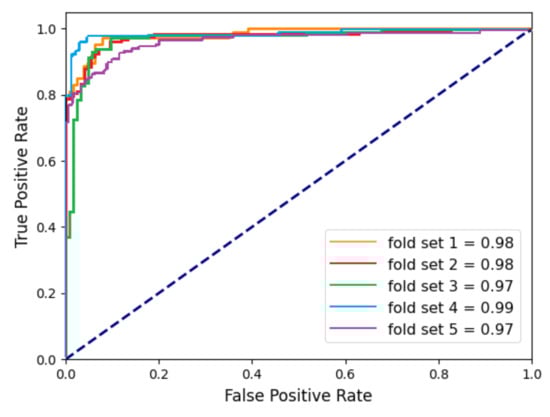 To confirm the effects of the ROI patch setting described in Section 2.2, the results of the classification experiments were compared when the original MR slices were used in the deep-learning network (Figure 3a) and when the ROI patches were used (Figure 3b). Table 2 shows the performance of the ResNet18-based classification network for individual MR slices. As shown in Table 2, when the ROI patch was used, the accuracy was 93.55%, with 92.87% recall and 94.69% precision, indicating excellent detection performance of bone marrow edema. Compared to the case of using the original MR image, the case of using the ROI patch showed an average of 10.10%, 7.74%, and 12.79% higher performance for accuracy, recall, and precision, respectively (Figure 7). Regarding the standard deviation in performance based on the fold set, the case using the ROI patch showed smaller variations than the case using the original MR image. These results show that the use of the ROI patch helps the network focus more on the key areas for determining bone marrow edema by removing unnecessary information from the MR slices. Applying the median filter improved the overall performance slightly, as shown in Table 2. Figure 7 shows the ROC curves for classifying bone marrow edema for individual MR slices after applying the median filter. The area under the curve (AUC) of the ROC curves for bone marrow edema for each of the five-fold set were 0.98, 0.98, 0.97, 0.99, and 0.97.