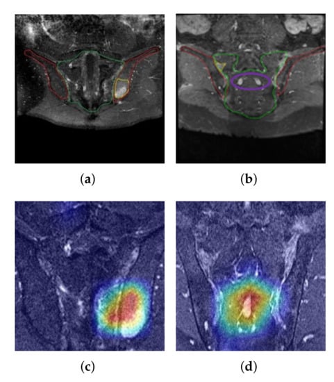 Figure 8a,b are positive samples with bone marrow edema (areas marked in yellow), whereas Figure 8c,d are the results of extracting the class activation map for the positive class from the last convolutional layer of ResNet18 given the images of Figure 8a,b as inputs, respectively, and mapping onto the input images. The areas marked in red in Figure 8c,d represent regions with the greatest activation, and the degree of activation decreases in the order of orange, yellow, green, and blue. Figure 8a,c show that the area used by the proposed network to predict the sample as positive coincides considerably with the area containing the lesion. This result suggests that the process of positively determining the sample using the proposed method is reasonable based on the information of the actual lesion area in addition to the numerical results of the classification rate. Meanwhile, Figure 8b,d show that the area activated by the network for presence of bone marrow edema was concentrated around the sacral bone rather than the SIJ region. This is because the structural features of the sacral bone area (marked in purple), which are indicated by bright pixels in the corresponding MR slice in Figure 8b, interfered with the detection of the bright pixel groups owing to bone marrow edema Figure 8d. These errors could be one of the causes for the reduced reliability of deep learning networks. Therefore, these errors may be overcome in the future if more sophisticated segmentation of the SIJ area were to become available for MR slices.