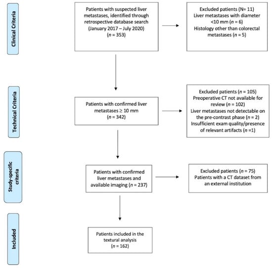 A total of 409 CLMs were analyzed in 162 patients; see Table 1 for an overview of the patients’ characteristics and see Figure 1 for an outline of the included/excluded subjects.