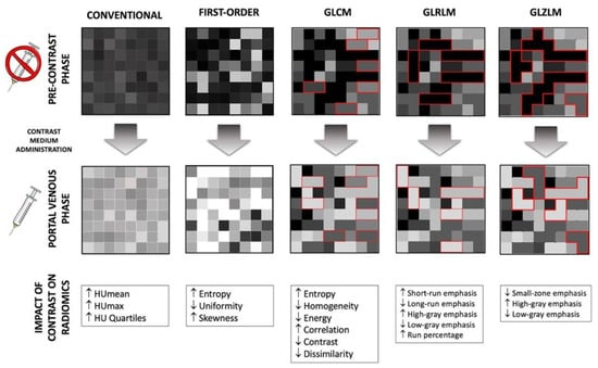 As expected, the contrast medium had a significant impact on tumor radiomics. It not only led to increasing of density-related features, which is already evident in standard radiology, but also influenced indicators of the curve shape (skewness) and the information content (uniformity and entropy). Considering second-order radiomic features, contrast enhancement impacted GLRLM and the small zone emphasis of GLZLM, which are related to microvasculature [22,23]. The radiomic analysis of portal phase provided a deeper insight on tumor heterogeneity and structural disorder than the analysis of pre-contrast series, as occurs in standard radiology. In fact, studies analyzing the portal venous phase of CT identified several associations between radiomics and tumor biology and prognosis [15]. It is noteworthy that the modification of radiomic features after contrast administration is independent of the tumor size.