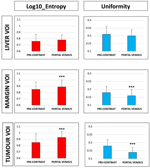 Comparison of entropy and uniformity of Tumor, Margin, and Liver volume of interest (VOI) in the pre-contrast vs. portal phase. *** p < 0.001.