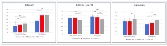 Comparison of intensity, entropy, and uniformity of Tumor volume of interest (VOI) vs. Margin VOI vs. Liver VOI in the pre-contrast and portal phase. *** p < 0.001.