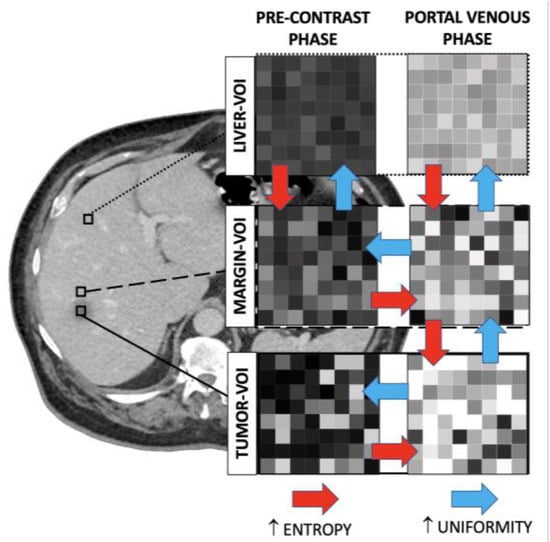 The following are available online at https://www.mdpi.com/article/10.3390/diagnostics11071162/s1, Table S1: Significance of feature difference of lesions’ high and volume VOIs between portal and pre-contrast phases, Table S2: Entropy and uniformity-related features values in the Tumor, Margin, and Liver VOI, Table S3: Differences in second-order features values across the Tumor, Margin, and Liver VOI in the portal and the pre-contrast phases.