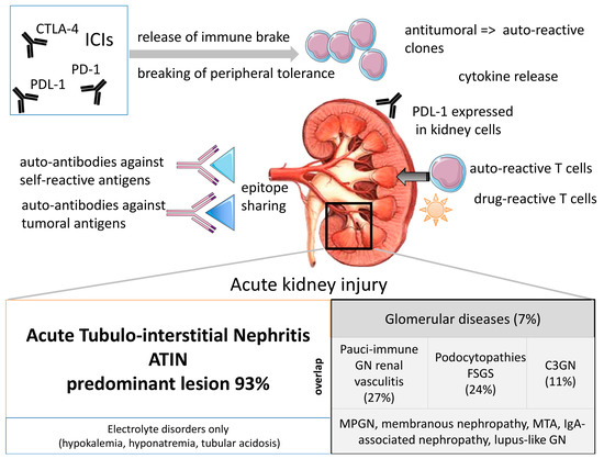 The renal complications of ICIs encompass a wide landscape. In a multicentric study of 138 patients with ICI-associated AKI, defined as a two-fold increase in serum creatinine or dialysis requirement directly attributed to ICIs, acute tubulointerstitial nephritis (ATIN) was the dominant lesion in 93% of the 60 patients biopsied [22]. However, glomerular lesions have also been reported recently [23]: 45 cases of biopsy-confirmed ICI-associated glomerular disease were identified. Several lesion types were observed, the most frequent being pauci-immune glomerulonephritis (GN) and renal vasculitis (27%) [24], podocytopathies (24%) (minimal change disease [25], or FSGS [26]), and complement 3 GN (C3GN; 11%). Concomitant AIN was reported in 41% of patients. Other glomerular lesions have been observed [27], including IgA-associated glomerulonephritis (GN) [28], Goodpasture syndrome [29], membranoproliferative GN [30], lupus-like nephropathy [16], and thrombotic micro-angiopathy [31]. Furthermore, an overlap between ATIN and glomerular diseases can be noted (Figure 1). Interestingly, in some patients, renal lesions were only revealed by electrolyte disorders, including hyponatremia secondary to hypophysitis, hypokalemia [32], and distal renal tubular acidosis [33].