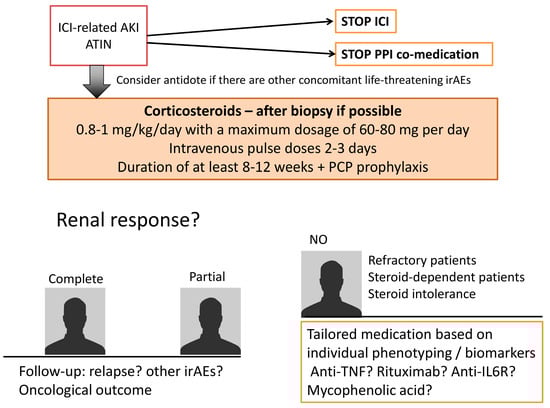 Once it has been established that the renal complication is ICI-related, the treatment strategy should be rapid and efficient because it has now been acknowledged that AKI leads to an increased risk of chronic kidney disease. Whereas a decrease in renal function normally implies morbidity, it means mortality in oncology patients because most subsequent treatments require the highest possible level of renal function. Resolving an irAE can take precedence over the response of the cancer to the ICI. Recent treatment strategies for ICI-related renal complications are summarized in the following paragraph as well as Figure 3.