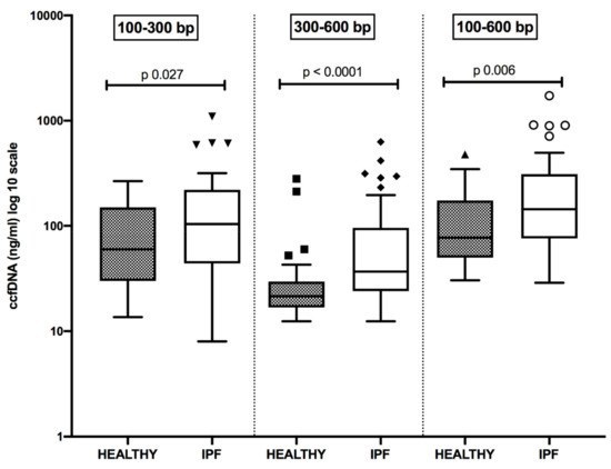 Distribution of plasma concentrations (log 10 scale) of small size circulating cell-free DNA (ccfDNA) in healthy subjects and patients suffering from idiopathic pulmonary fibrosis (IPF). All comparisons are statistically significant.