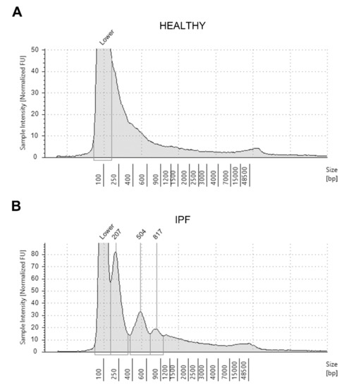 Representative graphs that allow catching the differences in the distribution pattern of ccfDNA fragments according to their size in a healthy subject (panel A) and an IPF patient (panel B) are shown in Figure 2.