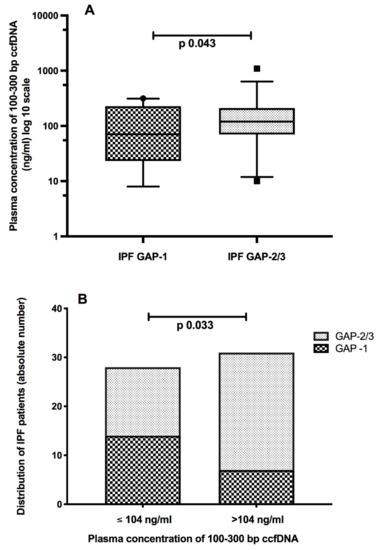 Plasma concentrations of 100–300 bp circulating cell-free DNA (ccfDNA) were significantly higher in idiopathic pulmonary fibrosis (IPF) patients with more advanced disease, according to the GAP (gender-age-physiology) staging score (A). The median cut-off of 104 ng/mL helps discriminating patients with advanced vs. milder disease (B).