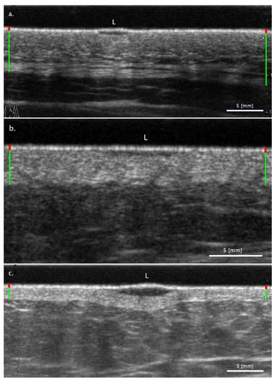 Representative ultrasound images of the three examined lesion types. (a) Nevus; (b) BCC; (c) MM. The primary layers of the skin are marked by the red (epidermis) and green (dermis) marks on the sides of the images. The lesions are marked by a white letter ‘L’ placed above them on the images.