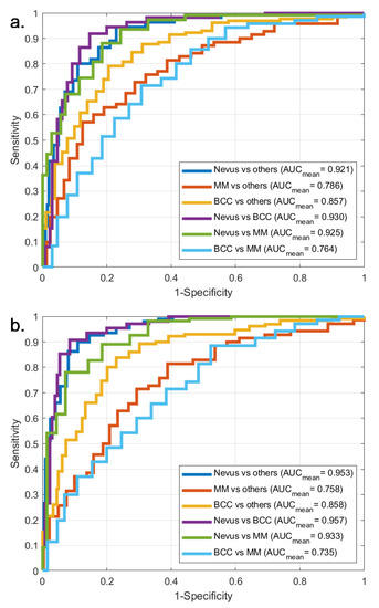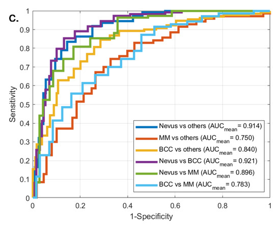 The following classes were distinguished for both binary and multiclass classification: ‘Nevus vs. others’, ‘MM vs. others’, ‘BCC vs. others’, ‘Nevus vs. BCC’, ‘Nevus vs. MM’, ‘BCC vs. MM’. In the cases of the binary classifications, ‘Nevus vs. BCC’, ‘Nevus vs. MM’ and ‘BCC vs. MM’ classifications were performed on datasets containing only lesions from the relevant two groups, while the corresponding multiclass classification results were obtained using datasets containing all three lesion types. ‘Nevus vs. others’, ‘MM vs. others’ and ‘BCC vs. others’ classifications were performed using datasets containing all three types of lesions in both binary and multiclass cases. Here, the binary classification training was conducted using two classes (a certain type of lesion versus all other lesions), while the multiclass classifications used three lesion type classes for training.