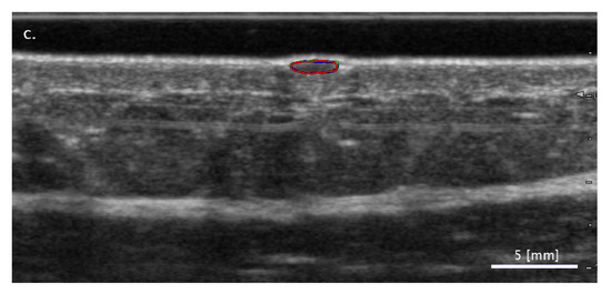 The source of the examined dataset was a commercial high-frequency ultrasound imager (HI VISION Preirus with 5–18 MHz EUP-L75 transducer connected to Hitachi Preirus, Hitachi, Tokyo, Japan). The current study involved N = 310 B-mode ultrasound images, containing skin lesions with a thickness of 1–2 mm. Three different types of skin lesions were distinguished, including 110 benign nevi, 130 BCCs and 70 recordings of MMs. Figure 1 illustrates a representative ultrasound image of each examined lesion type.