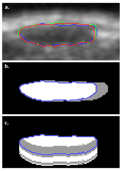 In the majority (71%) of the cases discussed here (6.3% of all images), the freehand-based method led to failing classifications while the LAR produced correct results. These were presumably due to human error in the freehand segmentation, since the pixel boundaries of the freehand lesion segmentation are relatively arbitrary in contrast to the LAR-based method, where the ACM model finds the boundaries of the lesion with a higher precision (Figure 4b).