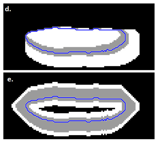 The SA segmentation methods, based on freehand and LAR segmentation, produced similar results generally; however, in certain cases, they led to different lesion classification results, such as in the cases presented in Figure 4. In the minority (29%) of such cases (2.5% of all images), the LAR-based method was the one failing the classifications. These were due to the shape of the lesion being such that the LAR segmentation could cover only a small portion of the lesion, which could not be expanded to cover the entire lesion even with the subsequent ACM method (Figure 4a).