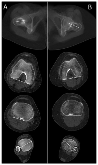 Torsional malalignment is a common lower limb abnormality in children and adults. Causes of torsional malalignment are multifactorial and may originate from overuse, trauma, muscular imbalance, or congenital disorders [1,2,3,4,5]. It is known that torsional malalignment is a risk factor for the development of osteoarthritis and related disorders [6,7,8,9,10,11]. A surgical correction may therefore be necessary to slow down or avoid joint deterioration in the long run. Hence, measurement of lower limb torsion is recommended as a crucial part of the clinical workup, e.g., after recurrent patellar dislocations [12,13,14]. Up to date, diagnosis of torsional malalignment is usually based on both clinical and radiological data.