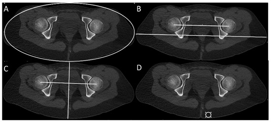 Measurement of body contour parameters at the femoral head level: best ellipsoid adaptation to the body contour (A), maximum body diameter right-left (RL) (B), and maximum body diameter anterior-posterior (C). Measurement of image noise in subcutaneous fatty tissue and contrast (cortical bone and surrounding skeletal muscle) at standardized anatomical positions for the calculation of CNR (contrast-to-noise ratio) (D).