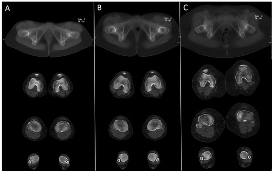 The new ULD protocols were acquired using the identical CT scanner (SOMATOM Definition Edge, Siemens Healthineers, Forchheim, Germany) with a pitch of 1.0, rotation time of 0.5 s, collimation of 128 × 0.6 mm, and a scan time of 2.21 s (hip), 2.11 s (knee), and 1.77 s (ankle). An automated tube current modulation (CARE Dose4D, Siemens Healthineers, Forchheim, Germany) was used for all regions (hip, knee, ankle). Furthermore, an automated tube voltage selection (CARE kV, Siemens Healthineers, Forchheim, Germany) was additionally used for all regions and was set to optimize the tube current for the depiction of osseous structures. Reference settings were set as following: hip (100 kV, 20 mAs), knee (80 kV, 20 mAs) and ankle (80 kV, 10 mAs). Furthermore, raw-data-based iterative image reconstruction (SAFIRE—Sinogram Affirmed Iterative Reconstruction, Siemens Healthineers, Forchheim, Germany) was used at strength 3 for all regions. Image reconstruction was performed using a medium sharp kernel, a 3 mm slice thickness, and a bone window (center/width: 450 HU/1500 HU) (see Figure 1).