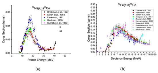 Cross section data for the production of cobalt-55 via the 58Ni(p,α)55Co (a) and 54Fe(d,n)55Co reactions (b) [20].
