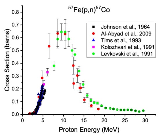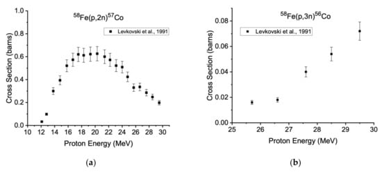 - Kolozhvari, A.A.; Gusev, V.P.; Smirnov, A.V.; Antropov, A.E.; Zarubin, P.P. Total Cross Sections for 57Fe(pn) at 5.2 and 6.1 MeV. Izv. Ross. Akad. Nauk. Ser. Fiz. 1991, 55, 168. [Google Scholar]