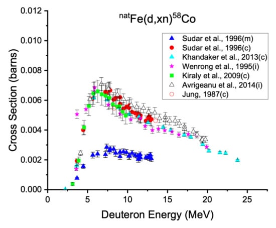 Excitation functions for the production of cobalt-58m,g from deuteron bombardment on natural iron targets. While 57Fe(d,n)58Co reaction is the dominant one, according to Sudar et al., 56Fe(d,γ)58Co and 58Fe(d,2n)58Co data also contribute to the measured excitation functions [29,58,59,60,61,62].