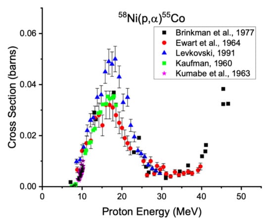 - Tanaka, S. and Furukawa, M. and Chiba, M. Nuclear Reactions of Nickel with Protons up to 56 MeV. J. Inorg. Nucl. Chem. 1972, 34, 2419. [Google Scholar] [CrossRef]