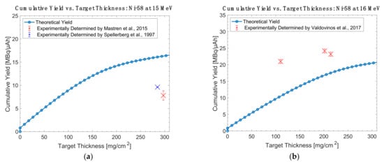 Thick target yield comparison between theoretical data and experimentally collected data for nickel-58 targets at (a) 15 MeV and (b) 16 MeV [14,23,26].