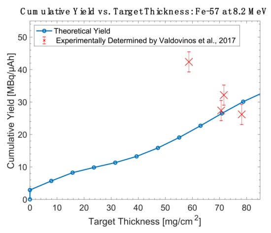 Thick target yield comparison between theoretical data and experimentally collected data for iron-57 targets at 8.2 MeV [26].