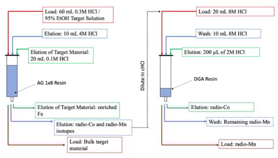 Separation of cobalt-5x from manganese is similar to the isolation of cobalt-5x from nickel targets, but can use even less concentrated acidic media. As summarized by Bate and Leddicotte in “The Radiochemistry of Cobalt”, manganese in a dissolved target solution passes through a AG1 × 8 anion-exchange resin in HCl concentrations > 4.5 HCl. Once the target material is removed, the column can be washed with <4.5 M HCl to elute cobalt-5x [94].