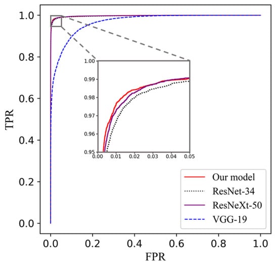 In order to validate the performance of our proposed compact cell classification model, we trained our model on the APL-Cytomorphology_LMU and the APL-Cytomorphology_JHH. The results are listed in Table 4 and Table 5. Our model was compared with ResNet [35], ResNeXt [36] and VGG net [37], which are famous classification models that achieved superior performances on blood cell classification tasks. For the sake of fairness, the architecture of all models followed their original papers and were trained on the same data partitioning. Based on Table 4 and Table 5, the area under the curve (AUC) of each model is very close except for VGG-19; our model yields the leading performance in all remaining metrics while having a relatively small number of parameters. It can be read from Table 6 that the size of our model is around one third of that of ResNet-34 or ResNeXt-50, and less than one tenth of VGG-19. Consequently, it has lower demands on the size of the training dataset and takes less time to train. The receiver operating characteristic (ROC) curve for each model is plotted in Figure 3 and the confusion matrices are given in Table 7 and Table 8.