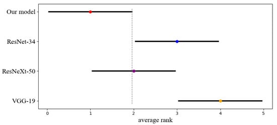 We performed the statistical analysis of the classification results using the non-parametric Friedman test and obtained a p-value = 0.0018, which is smaller than 0.05, to prove that the performance differences of the four models are statistically significant. We then visualized the difference between the average ranks of the four models using the Critical Distance (CD) diagrams made from the results of the post-hoc Nemenyi test () as shown in Figure 4. The dot shows its average rank value, and the horizontal line with the dot at the center shows the size of its Critical Distance. Our model is significantly better than the ResNet-34 and VGG-19.